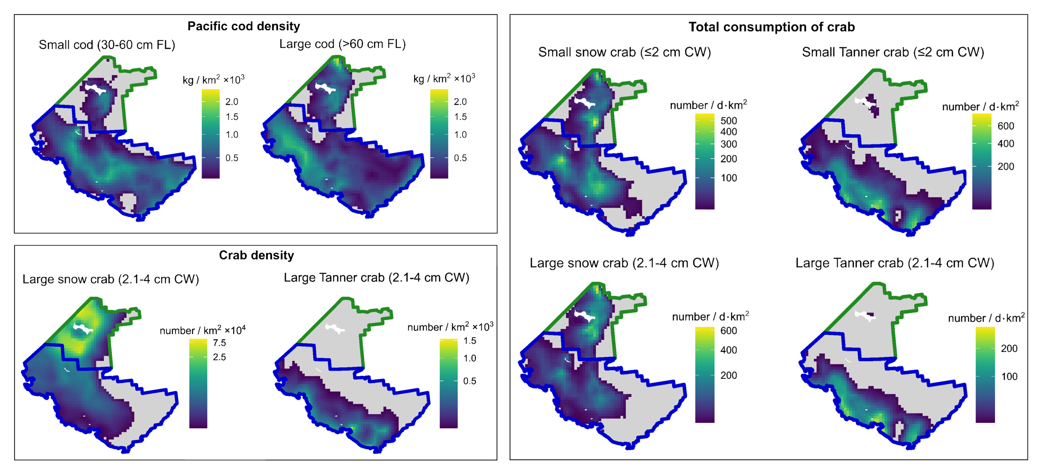 On the left, figures show time-averaged maps of predicted densities of Pacific cod, snow crab, and tanner crab in the study area. The right image illustrates the total consumption rates of crab by Pacific cod. Credit: NOAA Fisheries. Clickk on the image to enlarge it