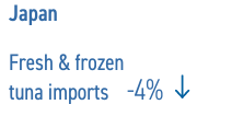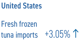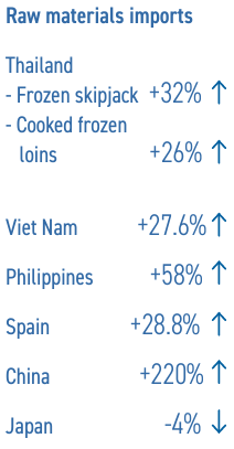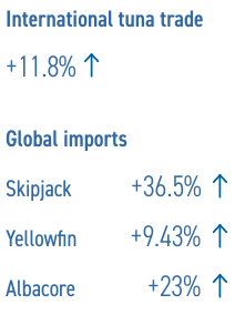 Las importaciones de atún congelado para reprocesamiento aumentaron en Vietnam (+27,65 por ciento a 98 841 toneladas); en Filipinas (+58 por ciento a 87 680 toneladas); España (+28,88 por ciento a 58 310 toneladas); y China (+220 por ciento a 55 777 toneladas). Por el contrario, las importaciones de atún congelado en Japón disminuyeron un cuatro por ciento a 94 886 toneladas durante este período, consistentes en atún no enlatado de alto valor y materia prima para enlatado
