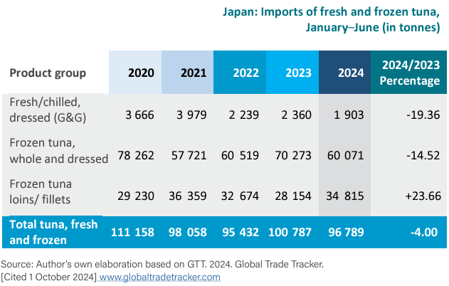 Se estimó que el comercio internacional de atún (todos los tipos de productos) fue de 1,91 millones de toneladas durante el primer semestre de 2024, un 11,8 por ciento más que en el mismo período del año anterior. Las importaciones mundiales de listado congelado durante este período fueron de 662 552 toneladas (+36,5 por ciento), seguidas del aleta amarilla congelado (+9,43 por ciento a 232 227 toneladas) y el atún blanco (+23 por ciento a 53 410 toneladas). Estos volúmenes se procesaron principalmente en productos enlatados y preparados; la excepción fue Japón, donde entre el 20 y el 25 por ciento del atún de aleta amarilla congelado se destinó al consumo directo, siendo generalmente de calidad sashimi y no enlatada.