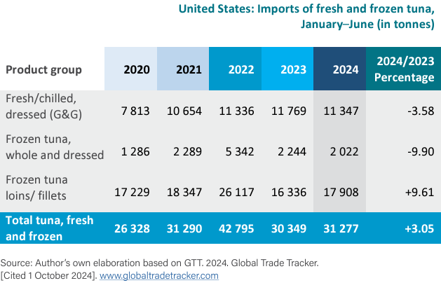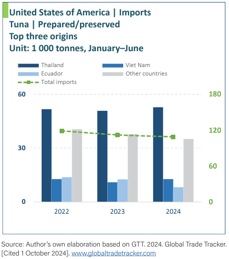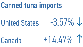 A fines de junio de 2024, las importaciones de atún enlatado en los Estados Unidos fueron un 3,57 por ciento más bajas, interanual. Como nota positiva, las importaciones aumentaron en Canadá en un 14,47 por ciento a 17 450 toneladas, abastecidas principalmente por Tailandia, Vietnam, Italia y Filipinas.