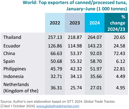 Los principales destinos de exportación fueron América del Norte (Estados Unidos y Canadá) y el Cercano Oriente: Libia (+37 por ciento); Israel (+108 por ciento); los Emiratos Árabes Unidos (+31 por ciento); y Egipto (+93 por ciento). Las exportaciones a mercados de alto valor como Australia, Nueva Zelanda y Suiza también aumentaron. Las importaciones de atún listo para comer, incluidos los productos de valor agregado, aumentaron en los mercados del sudeste asiático de Malasia y Singapur durante enero-junio de 2024, a pesar del sobreprecio del 20-30 por ciento en comparación con el atún convencional en salmuera. En cambio, las importaciones disminuyeron en Japón un 13,3 por ciento, hasta las 20 117 toneladas, pero aumentaron en Australia (+16,6 por ciento) y Nueva Zelanda (+30 por ciento) en comparación con el primer semestre de 2023.