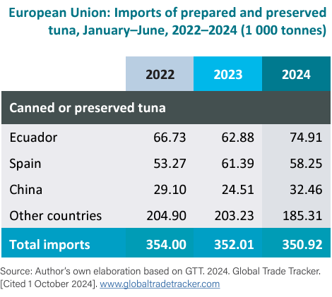 La demanda de atún preparado y enlatado en los mercados de la Unión Europea ha sido decepcionante durante enero-junio de 2024. Las importaciones bajo el código SA 160414 alcanzaron su nivel más bajo en tres años en volumen y valor, con 351 488 toneladas y 582,28 millones de dólares; de este total, el 30 por ciento comprendía lomos cocidos congelados comprados por los enlatadores de atún europeos para procesar productos listos para consumir de mayor valor.