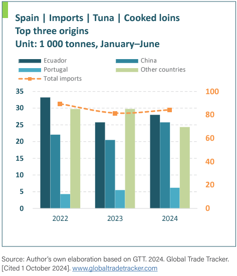 Los países de Asia-Pacífico, África y América Latina suministraron más de 230 000 toneladas de atún semiprocesado y procesado a la Unión Europea, incluidas 100 978 toneladas de lomos cocidos durante este período. Los principales proveedores fueron China, Ecuador, Indonesia, Papua Nueva Guinea, las Islas Salomón y Filipinas.