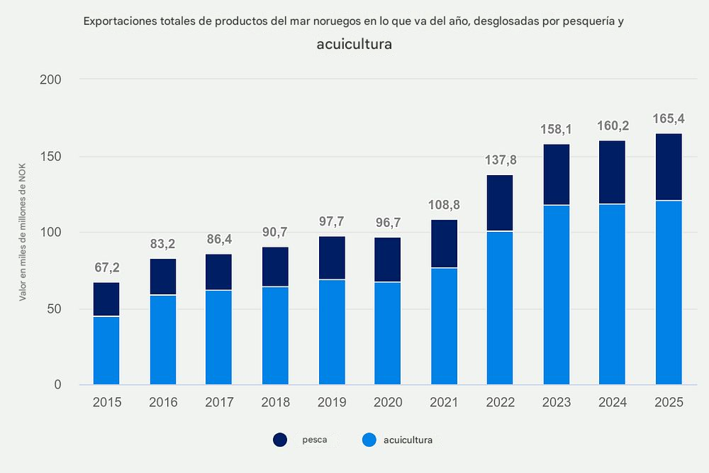 A pesar de la reciente caída, el valor total de las exportaciones de productos del mar en lo que va del año ha alcanzado los $15.28 mil millones (NOK 165.4 mil millones), un aumento de $479 millones (NOK 5.2 mil millones), o un 3 por ciento, en comparación con el año pasado. Si las exportaciones de Diciembre se mantienen al mismo nivel que el año anterior, se proyecta que el valor total para 2025 supere los $16.63 mil millones (NOK 180 mil millones), superando el total de 2024 de $16.15 mil millones (NOK 175.2 mil millones).