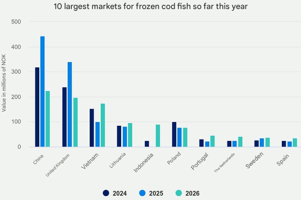 “High and fluctuating tariffs on imports from China to the US through 2025 reduced China's competitiveness in exporting frozen cod fillets to the US market. This resulted in lower Chinese demand for frozen whole cod. Although both Vietnam and China now face the same tariffs on frozen cod fillets to the US, the shift away from China as a processing market will continue into 2026," says seafood analyst Eivind Hestvik Brækkan of the Norwegian Seafood Council.