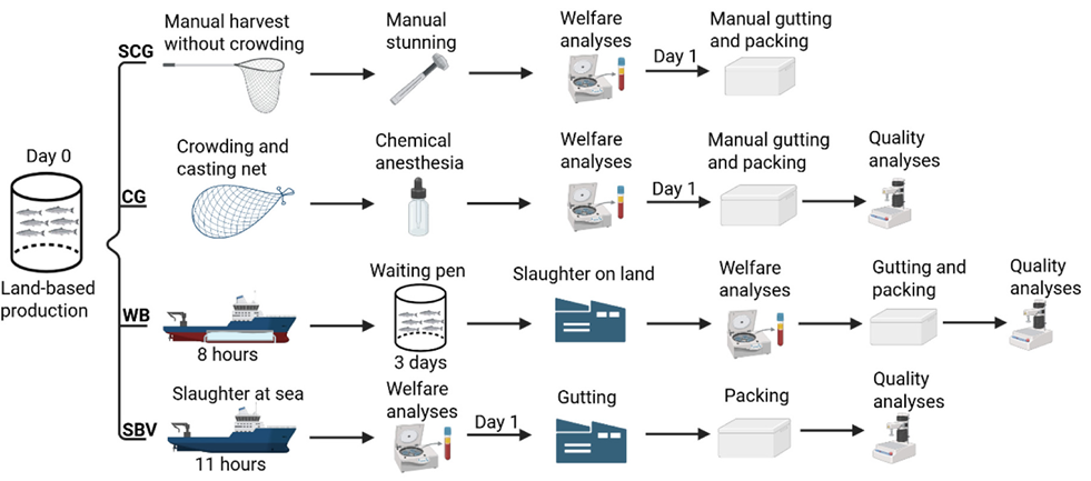 The research compares two widely used approaches: at-sea slaughter using stun-and-bleed vessels and traditional well-boat transport followed by land-based processing .