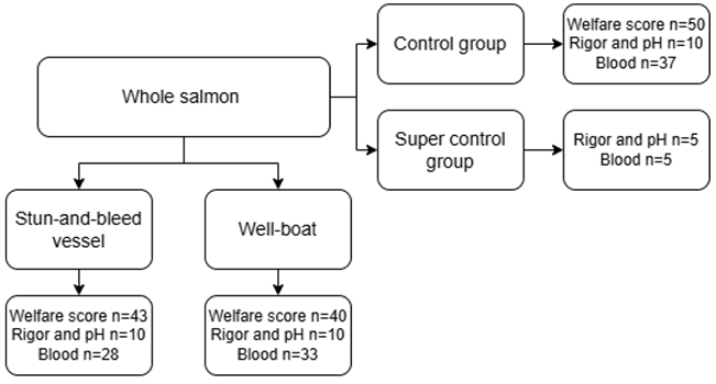 Experimental setup for the welfare assessment of welfare scores, blood measurements, rigor mortis, and pH.