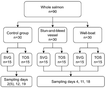 Experimental setup for the quality assessment. SVG and TOS represent Nofima in Stavanger and Tromsø, respectively. For the control group, sampling was done on day 2 at Stavanger and day 5 at Tromsø.