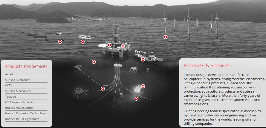 Además de las adquisiciones, Imenco ha estado desarrollando constantemente productos y sistemas para el sector marino, especialmente relacionados con las operaciones submarinas, y actualmente ofrece sistemas de buceo: buceo con aire y saturación, cámaras submarinas y electrónica, herramientas y equipos submarinos, sistemas de reabastecimiento de helicópteros y Una amplia gama de equipos de elevación y manipulación.