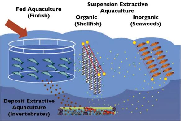 This diagram of an integrated multi-trophic aquaculture operation illustrates a combination of trophic levels sharing the environment and taking advantage of available organic and inorganic nutrients. (Source: Global Aquaculture Advocate)