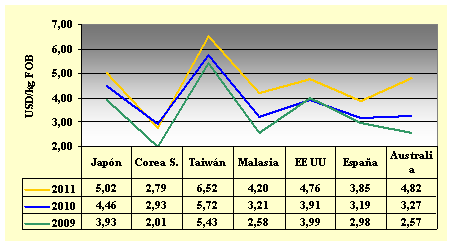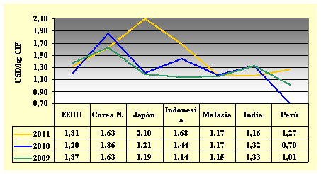 El precio promedio de importación de enero 2011 (USD 1,35/kg CIF) un 1% menos que en diciembre 2010 (USD 1,36/kg) y un 7% más alto que en enero 2010 (USD 1,26/kg).