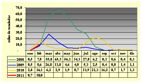Estas cifras son menores en un 13% en volumen y en un 9% en valor CIF que lo importado en diciembre 2010; con respecto a enero 2011, estas cifras son mayores en un 6% en volumen y en un 38% en valor CIF.