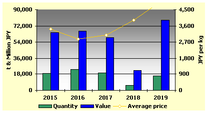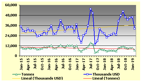 In the first two months of the year, they totalled 15,772 tons for USD 78,325,000, 26% higher volume and 62% higher value than in the previous year.