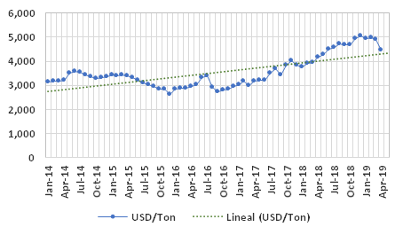 Graph 1: Average CIF price at US Customs of imports of frozen fillets of catfish (Basa/Panga) (HS 0304620020), 2015–2019, USD/t