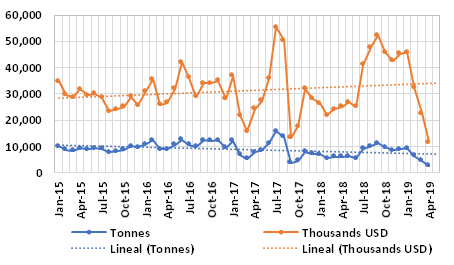 In April, incoming volumes of frozen fillets of catfish -basa and panga- reported 2,597 tonnes, worth CIF USD 11,597,000, down 43% in volume and 49% in value on those imported in the previous month and down 57% in volume and 54% in value on those of April 2018.