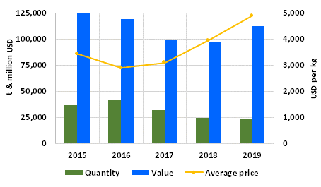 Graph 2: US imports of frozen fillets of catfish (Basa/Panga) (HS 0304620020), 2015–2019, tonnes and thousands USD