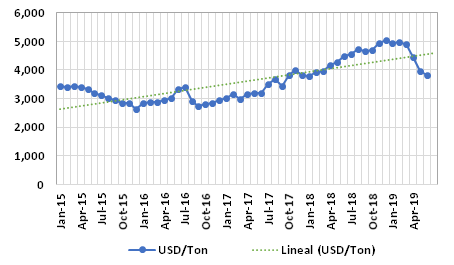 Graph 1: Average CIF customs price of US imports of frozen pangasius fillets (HS 0304620020), 2015–2019, USD/t