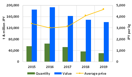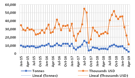 In the period totalled 30,128 tonnes for USD 140,309,000, 18% lower volume and 6% lower value than in the previous year. Vietnam was the supplier of 29,548 tonnes while China was the source of 579 tonnes.