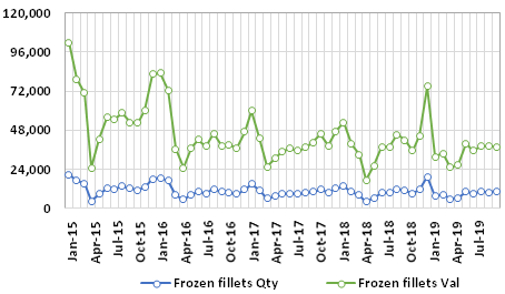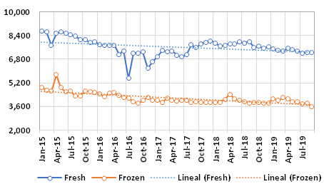 In September, the average price of imported fresh fillets at Customs was similar on that of the previous month and down 4% on that of September 2018. The price of frozen products was USD 3,587/kg down 7% on that of August and 8% to that of September 2018.