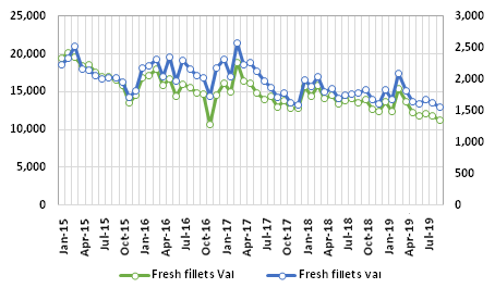 In September imports of fresh fillets were 1,550 tons for USD 11,270,000, 5% lower volume and value than the previous month and down 13% in volume and 17% lower value than in September 2018. In the first nine months of the year they totaled 15,522 tons and USD 114,317,000, 6% less in volume and 12% less in value than in 2018.