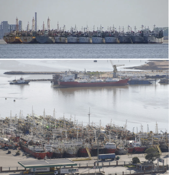 Above: Asian jigging fleet anchored in the roadstead of the port of Montevideo. Below: sector for foreign fishing vessels | Photo: Milko Schvartzman