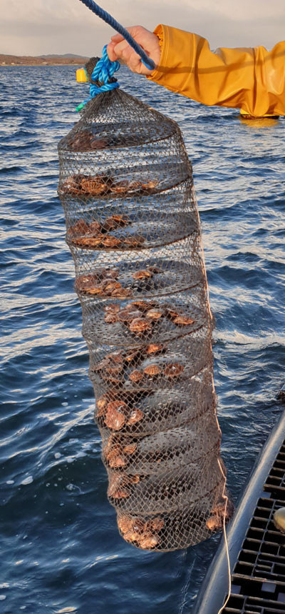 The extractive species at Lehanagh Pool, which filter out particulate waste from the water as food, are large great (or king) scallops, smaller variegated scallops, and native Ostrea edulis oysters. Minerals and carbon already dissolved into the water are extracted by several types of seaweed. If this were a commercial operation, all these species could be sold to consumers.
