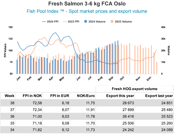 El volumen de exportación de la semana 38 aumentó 774 toneladas (+2,8%) con respecto a la semana anterior y 3.822 toneladas (+15,3%) con respecto a la semana correspondiente del año pasado, informa Fish Pool ASA.
