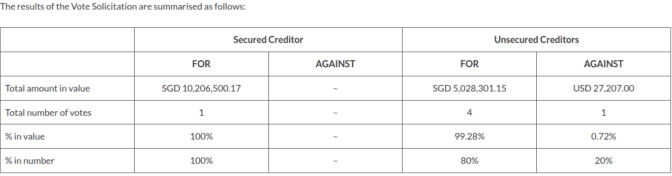 - Of the 10 unsecured Scheme Creditors, 1 unsecured Scheme Creditor did not submit their Proof of Debt Form and Voting Form to the Scheme Manager by the POD Cut-Off Date. Accordingly, pursuant to Clause 9.2 / 9.3 of the Scheme of Arrangement, the Scheme Creditor shall be deemed to have waived their right to vote on the Scheme and any entitlement to any benefits under the Scheme.