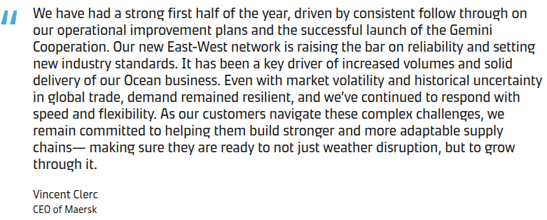 A major milestone was the successful launch of the Gemini Cooperation, a new East-West network that, in its first few months of operation, exceeded the 90% reliability target. According to Maersk CEO Vincent Clerc, this initiative has been a key driver for the increased volumes and solid delivery of their Ocean business.