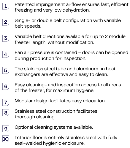 The ADVANTEC™ Narrow offers a practical transition to full impingement freezing without requiring major facility redesigns. By maintaining high-capacity performance in a reduced footprint, the system enables longer production hours and improved operational efficiency compared to traditional cryogenic solutions.