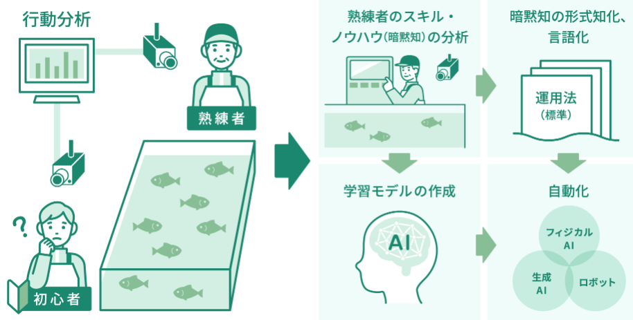 From reliance on human expertise to aquaculture powered by Physical AI: NTT Green & Food (hereinafter NTT G&F) aims to standardize workflows and develop Physical AI systems that integrate artificial intelligence—capable of learning and modeling these standardized processes—with robots designed to ultimately execute physical tasks.