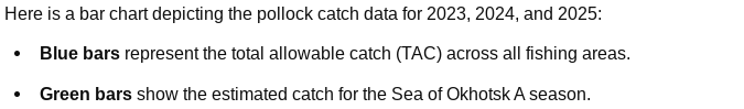 For 2025, the total allowable catch (TAC) for pollock is set at 2.461 million tons, with 1.1 million tons allocated to the Sea of Okhotsk, Russia's most significant pollock fishing region. The fishing season in this area is divided into two periods: Season "A," running from January 1 to April 10, and Season "B," from October 15 to December 31.