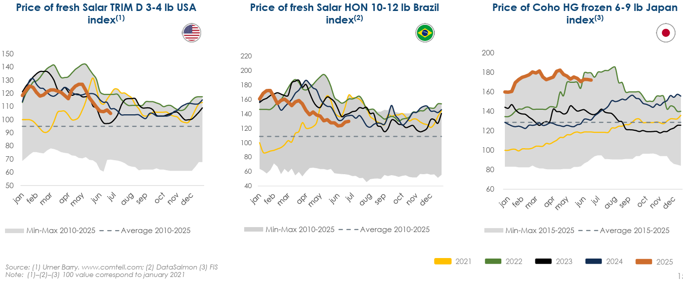 The salmon segment's performance showed mixed results in the second quarter of 2025, with a decline in sales volumes and prices due to increased production in Norway (+26%) and Chile (+15%). However, Agrosuper's diversification strategy has helped mitigate these effects. The company has benefited from the strong performance of Pacific salmon in Japan, where prices have been higher due to lower local supply.