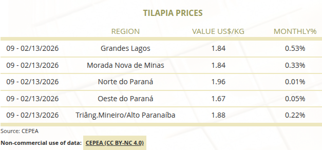 Tilapia prices recorded slight increases between February 9 and 13, maintaining stability in Brazil’s leading producing regions, according to the Center for Advanced Studies in Applied Economics (Cepea).