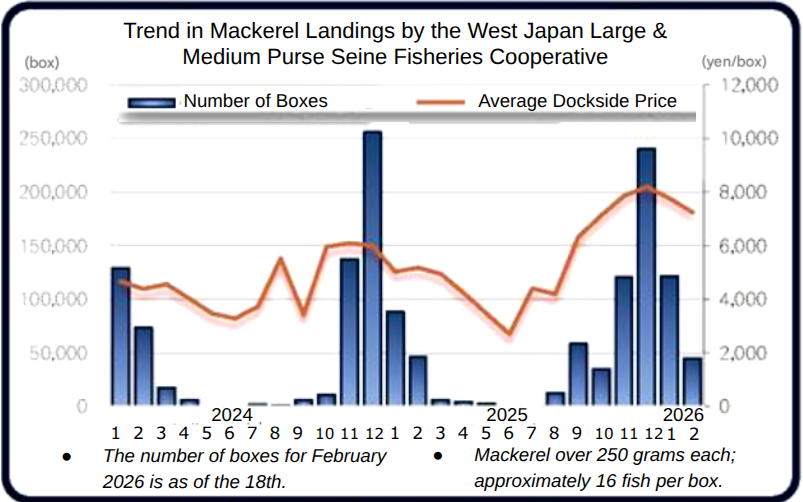 The peak fishing season for chub mackerel (over 250 grams per fish) in the waters off Kyushu by the West Japan Purse Seiner fleet (large and medium-sized) is drawing to an end. This month's (1st to 18th) catches were as good as the same period last year, but the fat content has dropped slightly. Sources in the fishing area say, "We're finally nearing the end of the fishing season. From March, we expect to shift to focusing on yellowtail."
