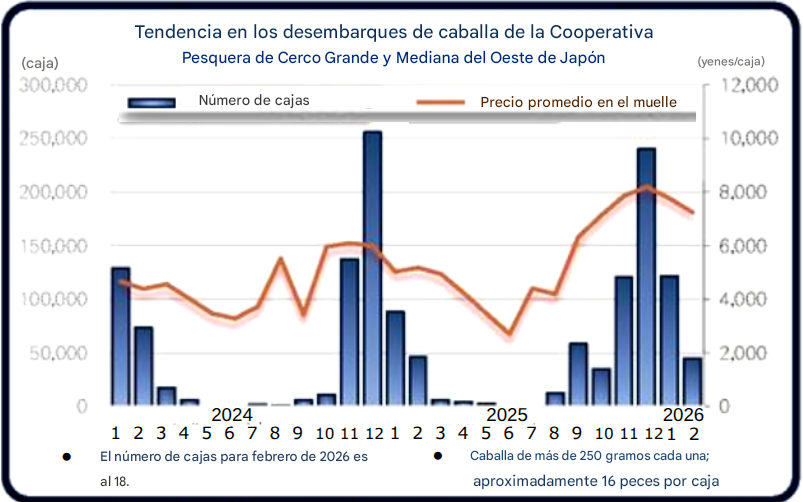 La temporada alta de pesca de caballa (más de 250 gramos por ejemplar) en aguas de Kyushu por parte de la flota de cerqueros del oeste de Japón (grandes y medianos) está llegando a su fin. Las capturas de este mes (del 1 al 18) fueron tan buenas como las del mismo período del año pasado, pero el contenido de grasa ha disminuido ligeramente. Fuentes de la zona pesquera afirman: "Por fin nos acercamos al final de la temporada de pesca. A partir de marzo, esperamos centrarnos en la jurel".