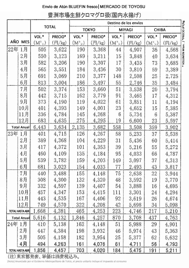 Movimiento mensual │ Atún rojo fresco│ Mercado de Toyosu │ desembarque nacional │ 2022-24
