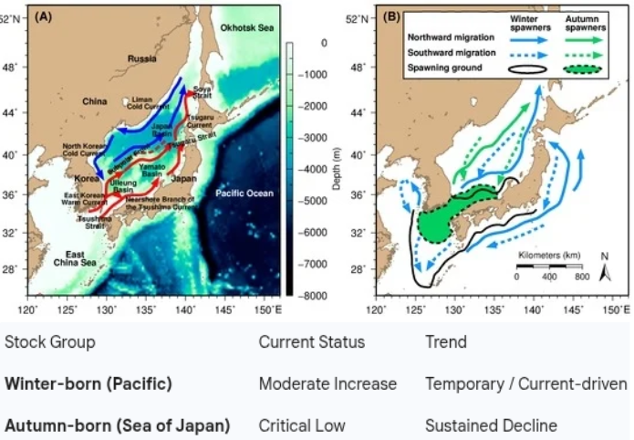 Despite the localized bounty in the Pacific, the broader picture is bleak. The autumn-born stock, which primarily supports the Sea of Japan fisheries, continues to hover at all-time record lows.