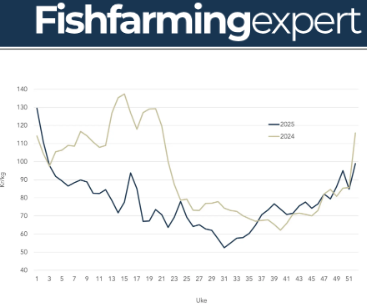 El precio medio semanal del salmón noruego en 2025 cerró en 77,21 NOK por kilo. Esto supone 15,53 NOK/kg por debajo del precio medio de 2024, de 92,74 NOK/kg.