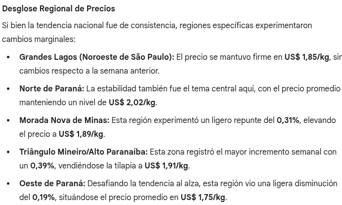 Una encuesta reciente del Cepea (Centro de Estudios Avanzados en Economía Aplicada) indica que los precios de la tilapia se mantuvieron predominantemente estables durante la semana que finalizó el 2 de enero de 2026. Los datos sugieren un equilibrio armonioso entre la oferta y la demanda al comenzar el nuevo año, registrándose solo fluctuaciones menores en los principales centros de producción del país.