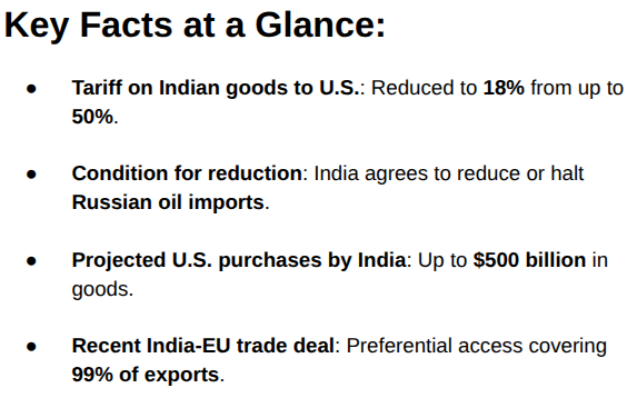 The tariff cut marks a dramatic reversal from the punitive trade measures introduced in 2025. In August that year, the US imposed an additional 25 % punitive tariff on Indian imports — on top of an existing 25 % reciprocal duty — in response to India's continued purchases of discounted Russian oil, effectively pushing tariffs on many products to 50 % or more .