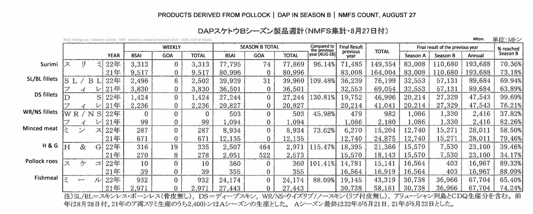 Products derived from alaska pollock and pacific cod (NMFS of DAP in GOA-BSAI): surimi, fillet, roe and fishmeal | week 34