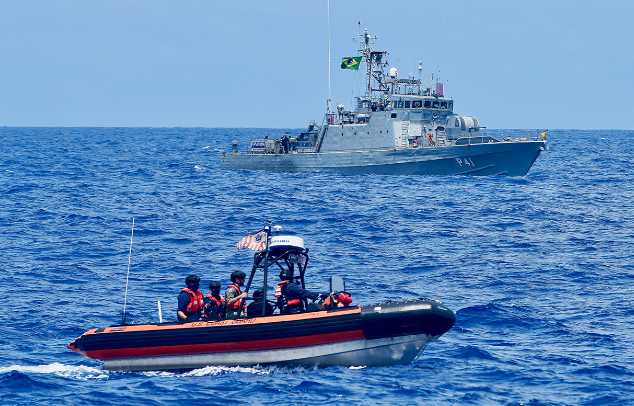 A small boat crew from the USCGC Stone (WMSL 758) drives alongside the Brazilian navy ship Guaiba off the coast of Northern Brazil on Jan. 4, 2021. The Stone and the Guaiba partnered together to share and practice law enforcement and rescue tactics as part of Operation Southern Cross. (Photo: U.S. Coast Guard Petty Officer 3rd Class John Hightower)