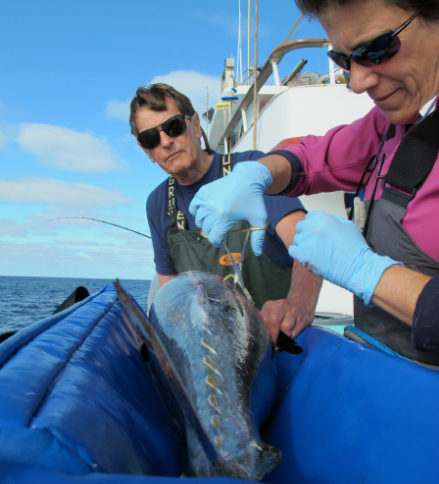 <-- Stanford scientists tag a Pacific bluefin tuna. Image source: Stanford University