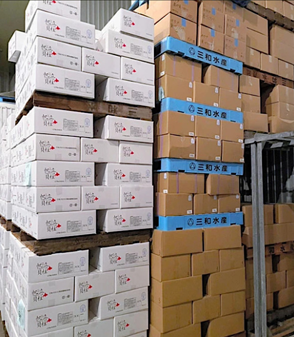 Packages of scallops stacked up in a cold storage warehouse in Monbetsu, Hokkaido, following China’s ban on Japanese seafood imports (Provided by Maruuroko Sanwa Suisan Co.) -->