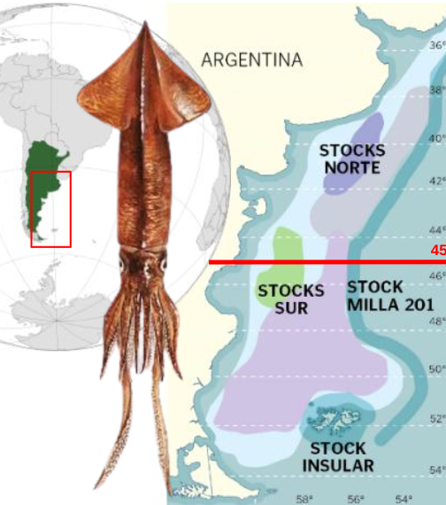 El calamar se encuentra ampliamente distribuido en la plataforma y el talud entre los paralelos 46° y 51° de latitud Sur, con mayores concentraciones en la plataforma intermedia (46°-49° Sur) y la plataforma externa al sur del paralelo 49° Sur. Los tamaños de los calamares capturados varían entre 83 y 322 mm de longitud de manto (LM), con machos mayormente maduros y hembras inmaduras.