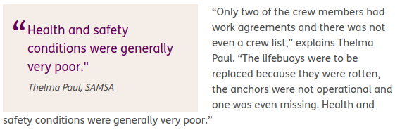 “Only two of the crew members had work agreements and there was not even a crew list,” explains inspector Thelma Paul. “The lifebuoys were to be replaced because they were rotten, the anchors were not operational and one was even missing. Health and safety conditions were generally very poor.”