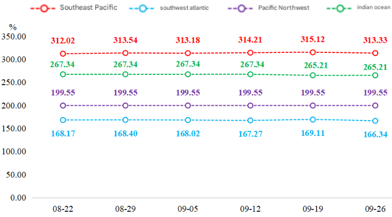 Northwest Pacific Ocean: Remained stable at 213.23 points. Most vessels returned to port, which slowed supply growth significantly and eliminated the pressure of oversupply, achieving a supply-demand balance.