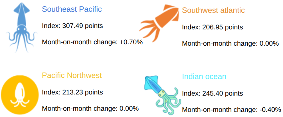 Southwest Atlantic: Remained stable at 206.95 points. Supply from the Falkland Islands held steady, and the total production for 2025 slightly exceeded the 48,000 tons of 2024, with no pressure for supply contraction.