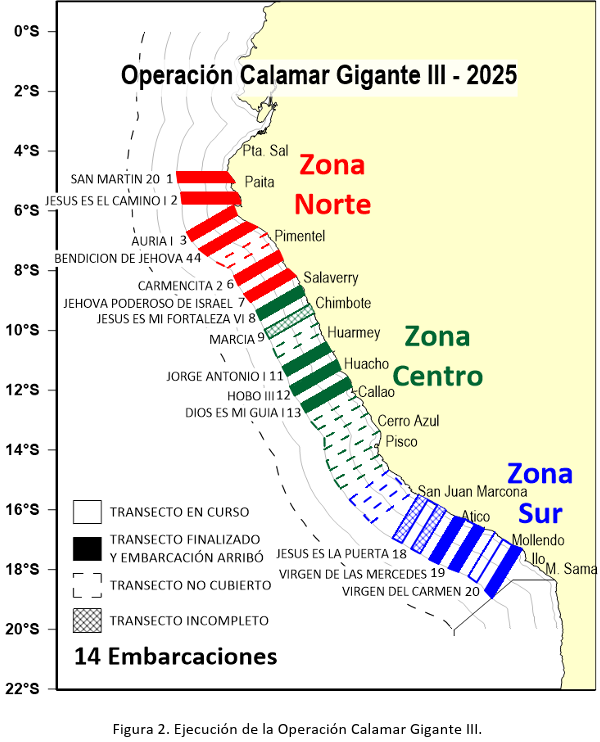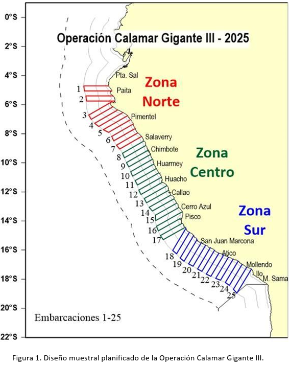 La pota es la segunda pesquería más importante del país desde 2004, desarrollada principalmente por la flota artesanal. La Operación Calamar Gigante III (OCG-III) fue ejecutada por 14 embarcaciones artesanales autorizadas y monitoreadas por el sistema SISESAT, y se llevó a cabo a lo largo de 17 de los 25 transectos planificados en las zonas norte, centro y sur del litoral peruano.
